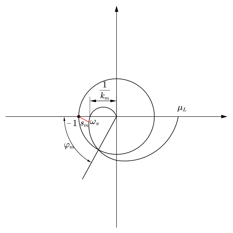 We can represent the gain margin \(k_m\) and phase margin \(\varphi_m\) in the Nyquist diagram,
