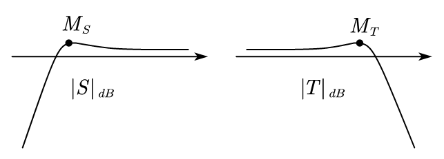 \(S\) behaves like a high pass filter, and \(T\) behaves like a low pass filter. \(M_S\), \(M_T\) is the peak of the bode plot.