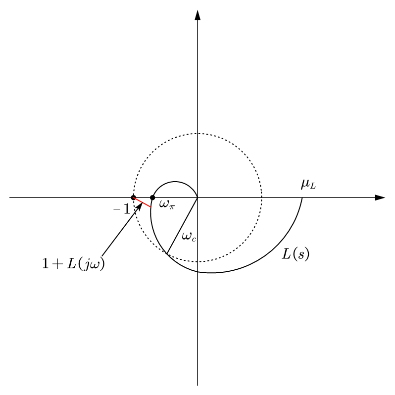 From the diagram, we can know the stability margin is: \(\min_\omega |1 + L(j\omega)|\).