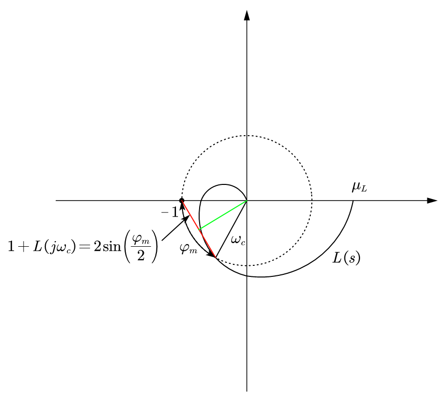 - the phase margin \(\varphi_m = \pi - |\angle L(j\omega_c)|\) is positive