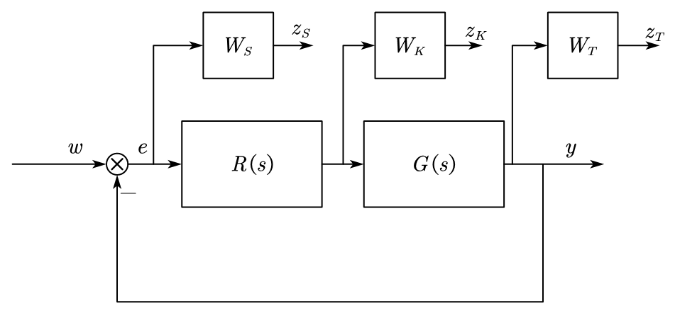 Where \(z = \begin{bmatrix} z_S & z_T & z_K \end{bmatrix}^T\) is the performance variables. \(w\) is external signals, and we have: \(z = \underbrace{\begin{bmatrix} W_SS & W_TT & W_KK \end{bmatrix}^T}_{G_{ZW}} w\)