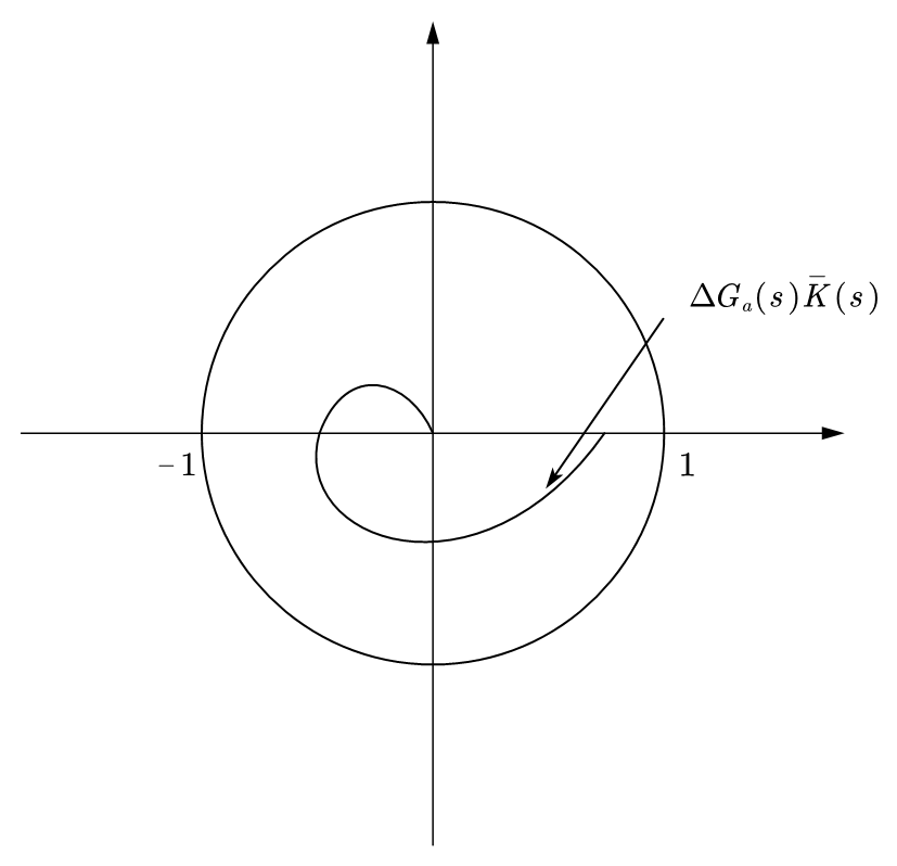 To make the system above stable, we need to meet the condition: \(||\Delta G_a(s)\bar K(s)||_\infty < 1\), we can draw the Nyquist diagram to explain this condition is a sufficient condition to A.S.: