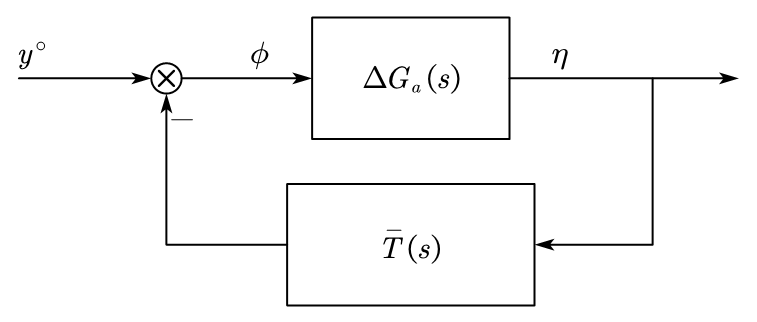 The TF from \(\eta \to \phi\): \(-\frac{R(s)\bar G(s)}{1+R(s)\bar G(s)} = -\bar T(s)\). The system schematic can be changed to:
