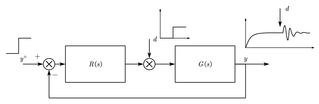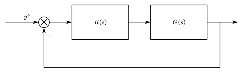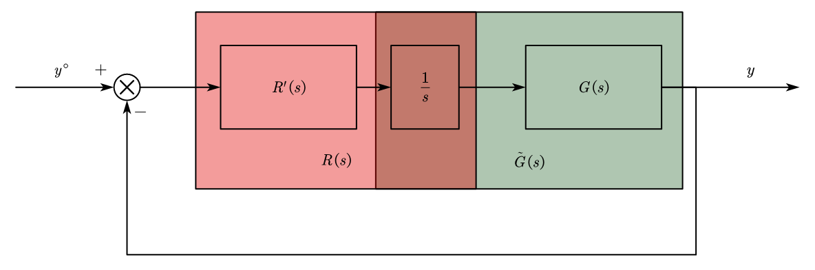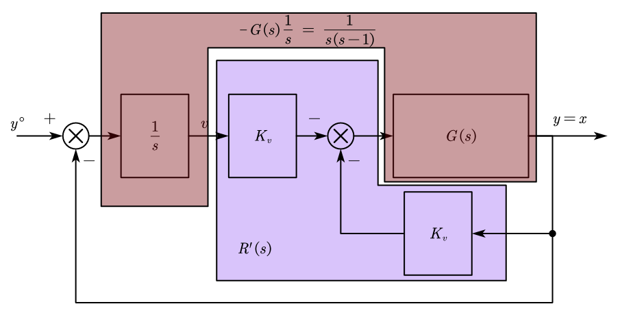 \[ \begin{aligned} \dot x &= x + u \\ y &= x \dot v= -x \end{aligned} \]\[ \begin{bmatrix} \dot x \\ \dot v \end{bmatrix} = \underbrace{\begin{bmatrix} 1&0 \\ -1&0 \end{bmatrix}}_{\tilde A} \begin{bmatrix} x \\ v \end{bmatrix} + \underbrace{\begin{bmatrix} 1 \\ 0 \end{bmatrix}}_{\tilde B} u \]\[ u = -K \begin{bmatrix} x \\ v \end{bmatrix} = -K_xx - K_vv \]The closed loop system is: