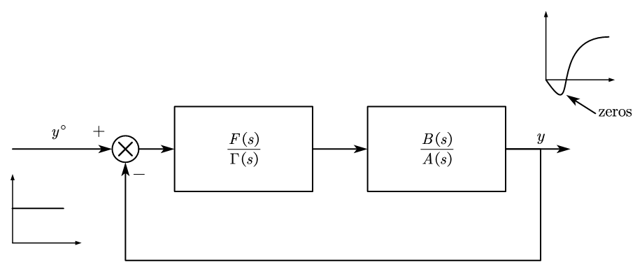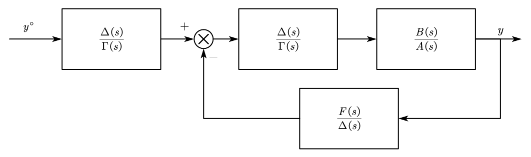 \[ \begin{aligned} &\tilde G(s) = \frac{1}{s(s-1)} & R'(s) = \frac{f_1s + f_0}{\gamma_1s + \gamma_0} \end{aligned} \]\[ \begin{aligned} P(s) &= (s^2 - s)(\gamma_1s + \gamma_0) + f_1s + f_0 \\ P^*(s) &= (s+1)^3 = s^3 + 3s^2 + 3s + 1 \end{aligned} \]\[ \begin{bmatrix} \begin{matrix} \begin{bmatrix} 1 \\ -1 \\ 0 \end{bmatrix} \\ 0 \end{matrix} & \begin{matrix} 0 \\ \begin{bmatrix} 1 \\ -1 \\ 0 \end{bmatrix} \end{matrix} & \begin{matrix} \begin{bmatrix} 0 \\ 0 \\ 1 \end{bmatrix} \\ 0 \end{matrix} & \begin{matrix} 0 \\ \begin{bmatrix} 0 \\ 0 \\ 1 \end{bmatrix} \end{matrix} \end{bmatrix} \begin{bmatrix} \gamma_1 \\ \gamma_0 \\ f_1 \\ f_0 \end{bmatrix} = \begin{bmatrix} 1 \\ 3 \\ 3 \\ 1 \end{bmatrix} \]\[ \begin{aligned} &\gamma_1 = 1 & f_1 = 7 \\ &\gamma_2 = 4 & f_0 = 1 \end{aligned} \]\[ R'(s) = \frac{f_1s+f_0}{\gamma_1s+\gamma_0} = \frac{7(s+\frac17)}{s+4} \] -