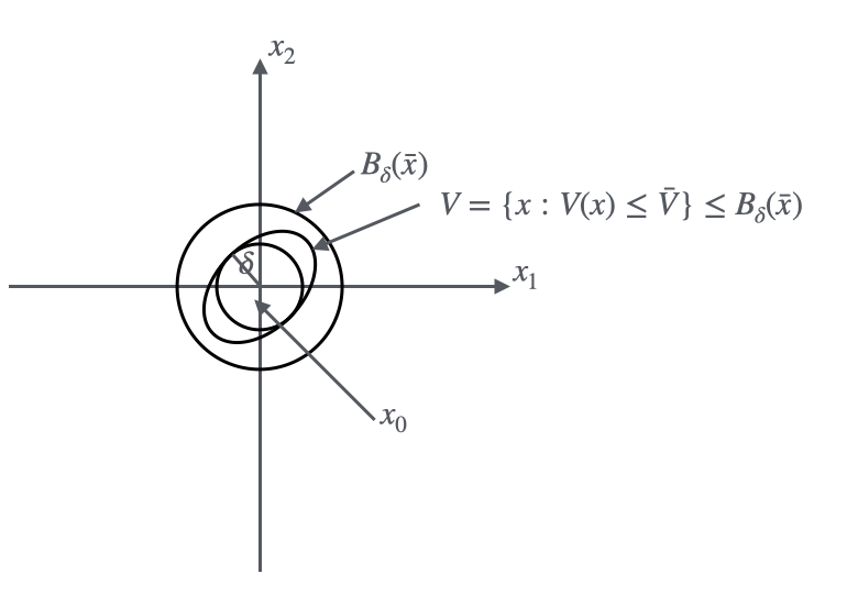 Giving Lyapunov function \(V\), \(\exists V(x) \in C^1\), that are PD in \(\bar x\), and \(\dot V\) is NSD in \(\bar x\), then \(\bar x\) is stable.