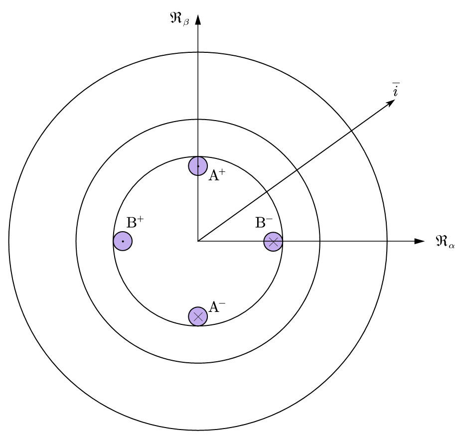 Thus, we have: \(\bar B = k \bar i\), where \(\bar i\) is the current space vector. We let \(\alpha = e^{j\frac23\pi}\), and we have the expression for \(\bar i\):