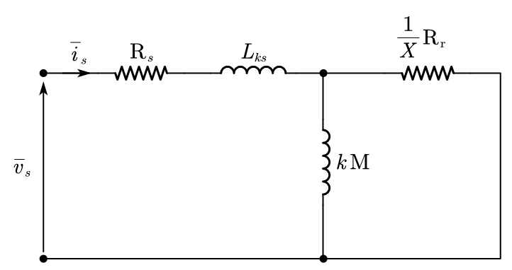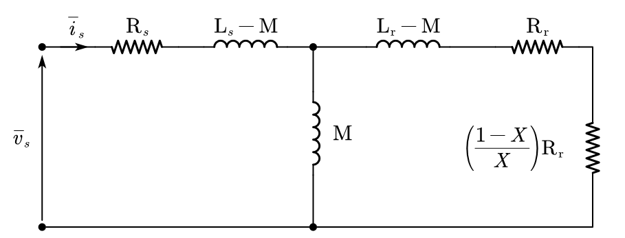 Which gives: \(-j\omega\bar \psi_r = \frac{1}{X} R_r \bar i_{r}\), and because \(\omega_m = (1-X)\omega\), the replacement for the motional term is: \(-j\omega_m\bar \psi_r = \frac{1-X}{X} R_r \bar i_{r}\). We can redraw the equivalent circuit: