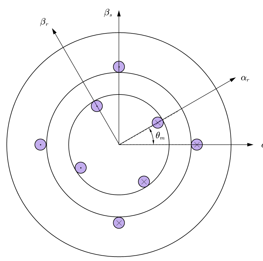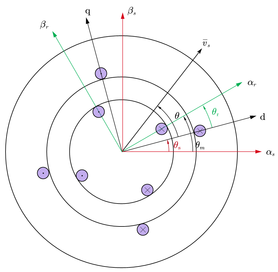 Assuming for the stator part, the \(\alpha\)-\(\beta\) axis have rotated a general angle \(\theta_s\), the new frame we called d-q axis, and we continue rotate for \(\theta_r\) to the rotor frame,